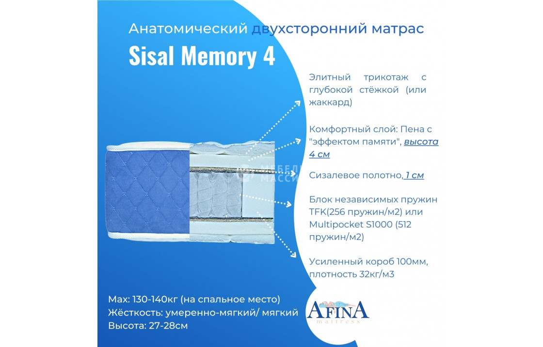 двусторонний Sisal Latex 3 / Sisal Memory 4 от фабрики афина с пружинным блоком tfk-256 (256 пружин на кв. метр) или multi-512 (512 пружин на кв. метр) на выбор. чехол жаккард стёганный 180-220 гр/м2 или элитный трикотаж с объёмной стёжкой 300гр/м2 на выбор. купите по цене производителя в интернет-магазине мебель массив.